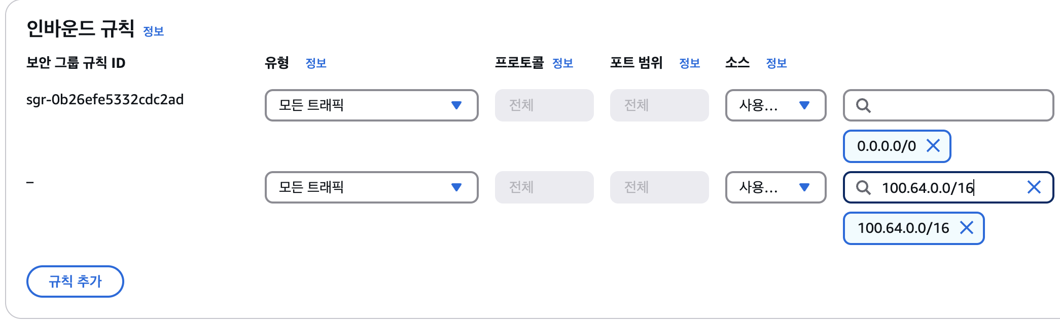필자의 경우 모든 사용자가 전체 VPC 대역을 이용할 수 있도록 하였지만, 이 설정은 원하는 대로 설정해도 됩니다.