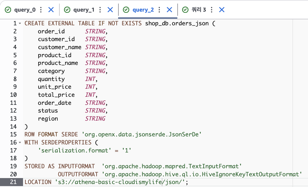 만약, JSON 파일을 대상으로 테이블을 생성하기 위해서는 쿼리를 아래와 같이 작성합니다.